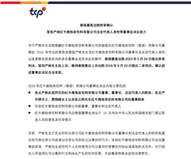 近日,泰國最高院對紅牛維他命飲料有限公司(下稱“中國紅牛”)控股大股東紅牛維他命飲料(泰國)有限公司(下稱:泰國紅牛)的人事任免董事會決議效力作出終審判決,確認其董事會決議是合法有效的,即罷免嚴彬在“中國紅牛“擔任董事長及法定代表人身份,泰國紅牛有權利向中國有關政府部門就嚴彬在董事會權力及身份變化進行相關變更登記事宜。