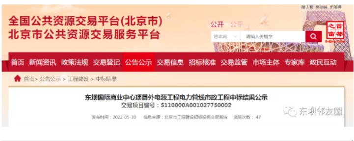 ?日前,東壩國際商業(yè)中心項目又有重要突破,北京市公共資源交易服務(wù)平臺于5月30日發(fā)布了東壩國際商業(yè)中心項目外電源工程電力管線市政工程中標(biāo)結(jié)果公示。中標(biāo)人是北京愛如電建設(shè)工程有限公司,中標(biāo)價為59544956.12元。