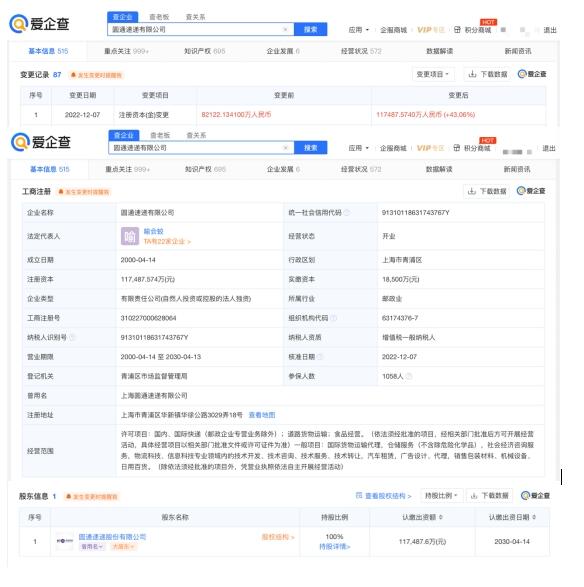 據(jù)愛企查App顯示,近日?qǐng)A通速遞有限公司發(fā)生工商變更,注冊(cè)資本由82122.1341萬人民幣,變更為117487.574萬人民幣,漲幅43.06%。該公司成立于2000年4月,由圓通速遞股份有限公司全資控股,法定代表人喻會(huì)蛟,經(jīng)營(yíng)范圍含國(guó)內(nèi)、國(guó)際快遞(郵政企業(yè)專營(yíng)業(yè)務(wù)除外);道路貨物運(yùn)輸;食品經(jīng)營(yíng)等。