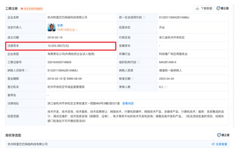 據愛企查App顯示,杭州阿里巴巴網絡科技有限公司發生工商變更,注冊資本由122億元減至約1.05億元。該公司成立于2018年3月,法定代表人、董事長兼總經理為張勇,由淘寶(中國)軟件有限公司全資控股。