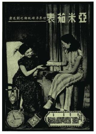 海報(bào)中的廣告正是女士手表,模特身穿旗袍,風(fēng)情萬種,大方地欣賞著這塊精美的手表,也讓我們能從其中窺見當(dāng)時(shí)上海的繁榮景象。